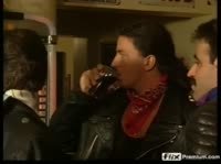 Послушная сучка на цепи, ползала по полу и заглатывала резиновое дилдо. А над не стоял мужик и дрочил. Позвав друзей, поимели в одну дырку, сразу двумя хуями.