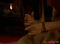 Под громкие мужские овации брюнетка в маске раздвигает ножки и дает чуваку пошалить в ее трусиках. Затем дамочка присаживается на корточки, и приступает дрочить и отсасывать член перед ликующей толпой.